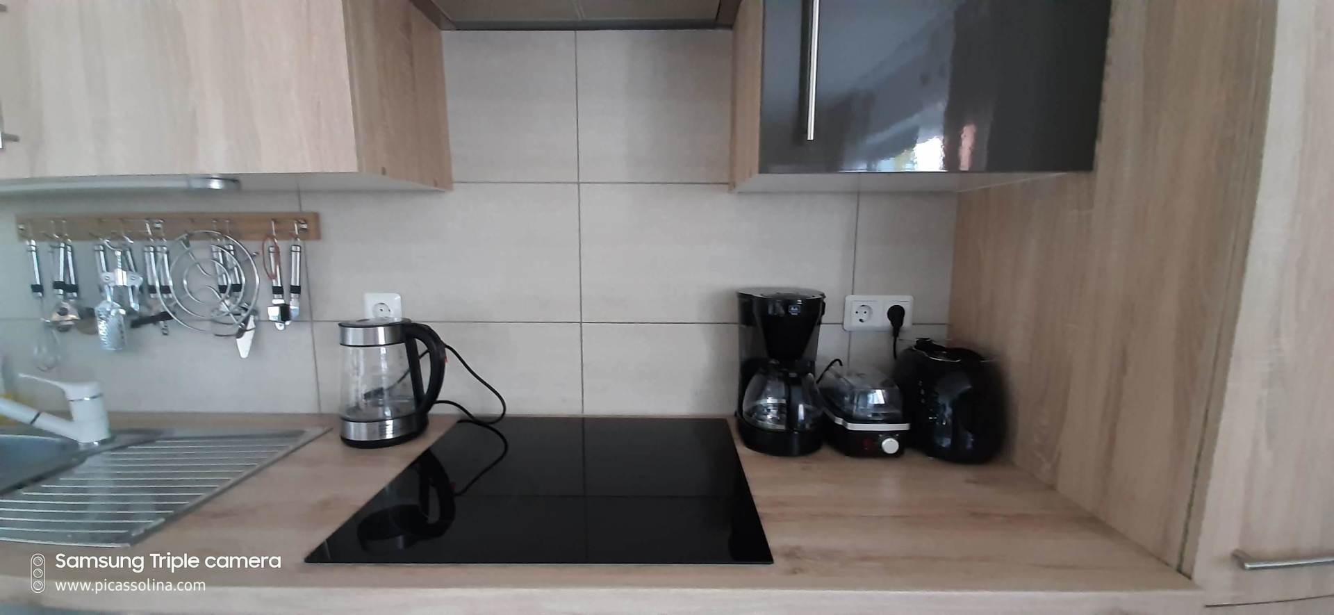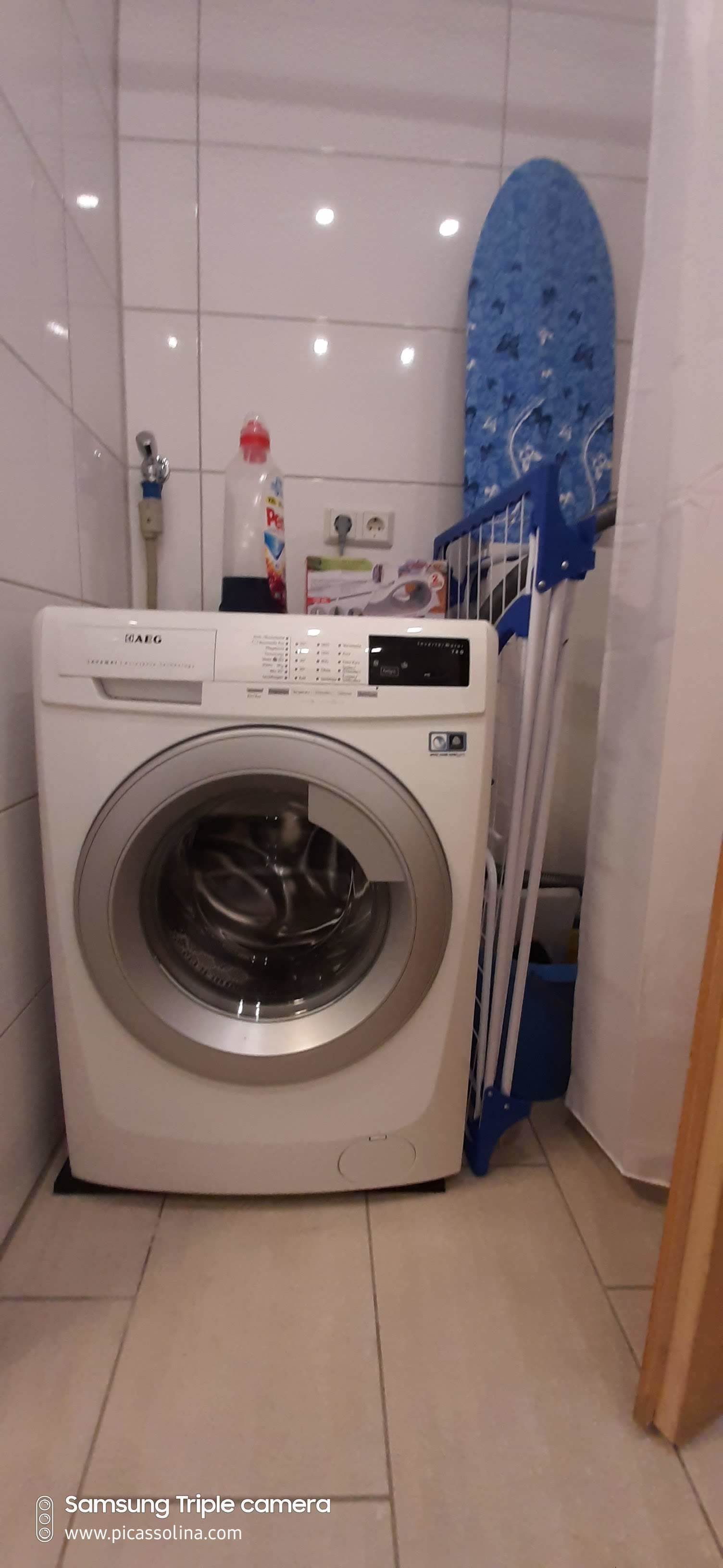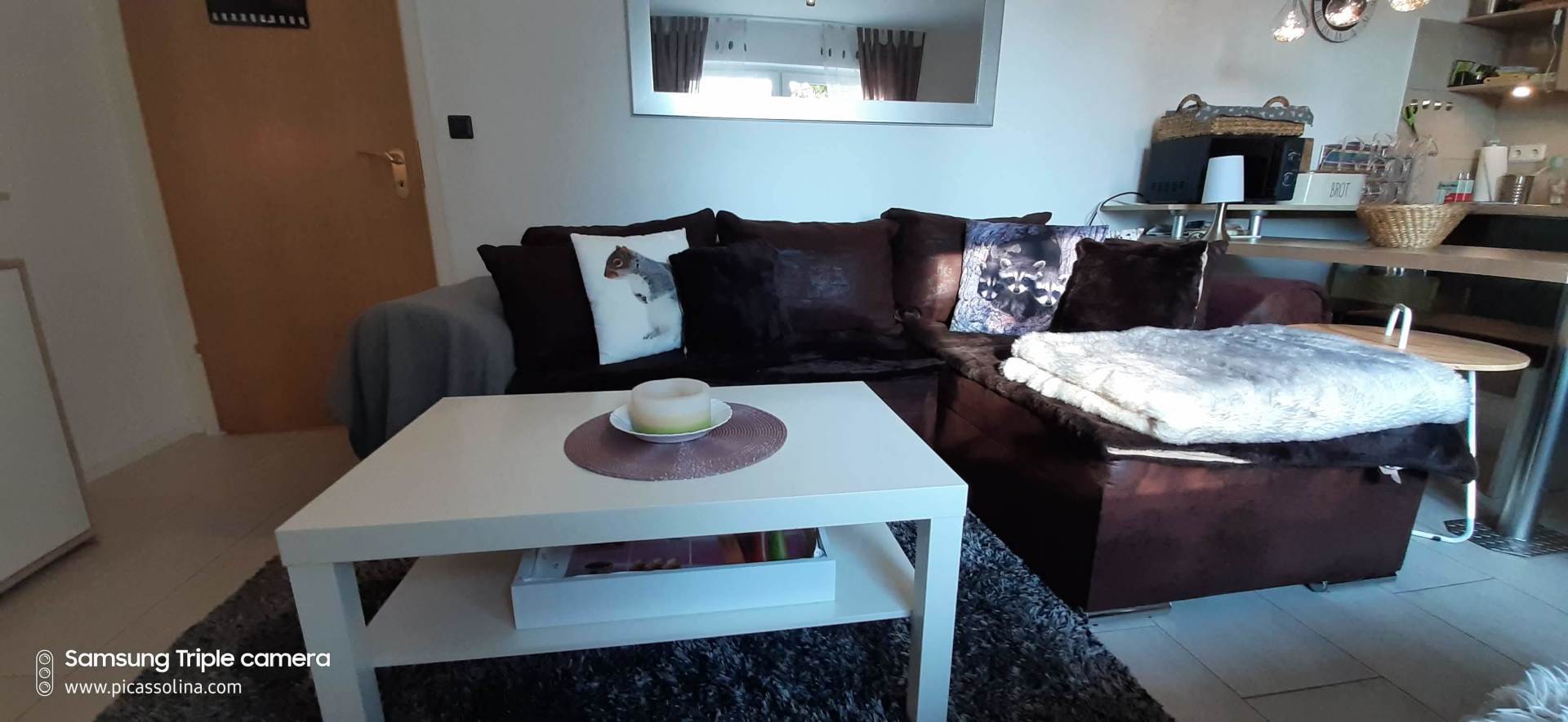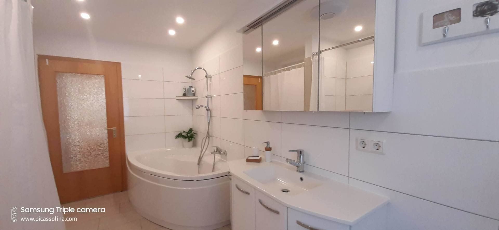 Aus dem Flur heraus kommt man jeweils zum geräumigen und hellen Badezimmer mit einer Badewanne und barrierefreier Dusche, zur gemütlichen Wohnküche mit allen Küchengeräten, TV und einem Schlafsofa, sowie zum Schlafzimmer mit großem Schrank, Bürotisch und einem Hometrainer.
