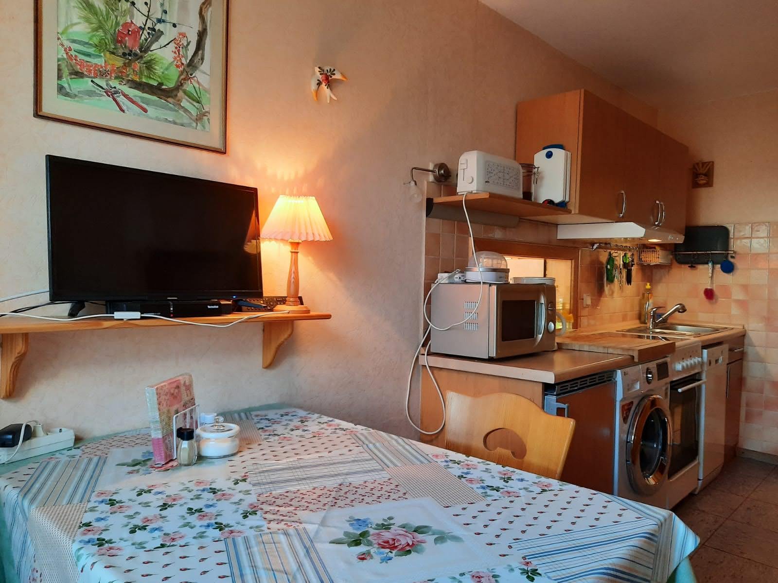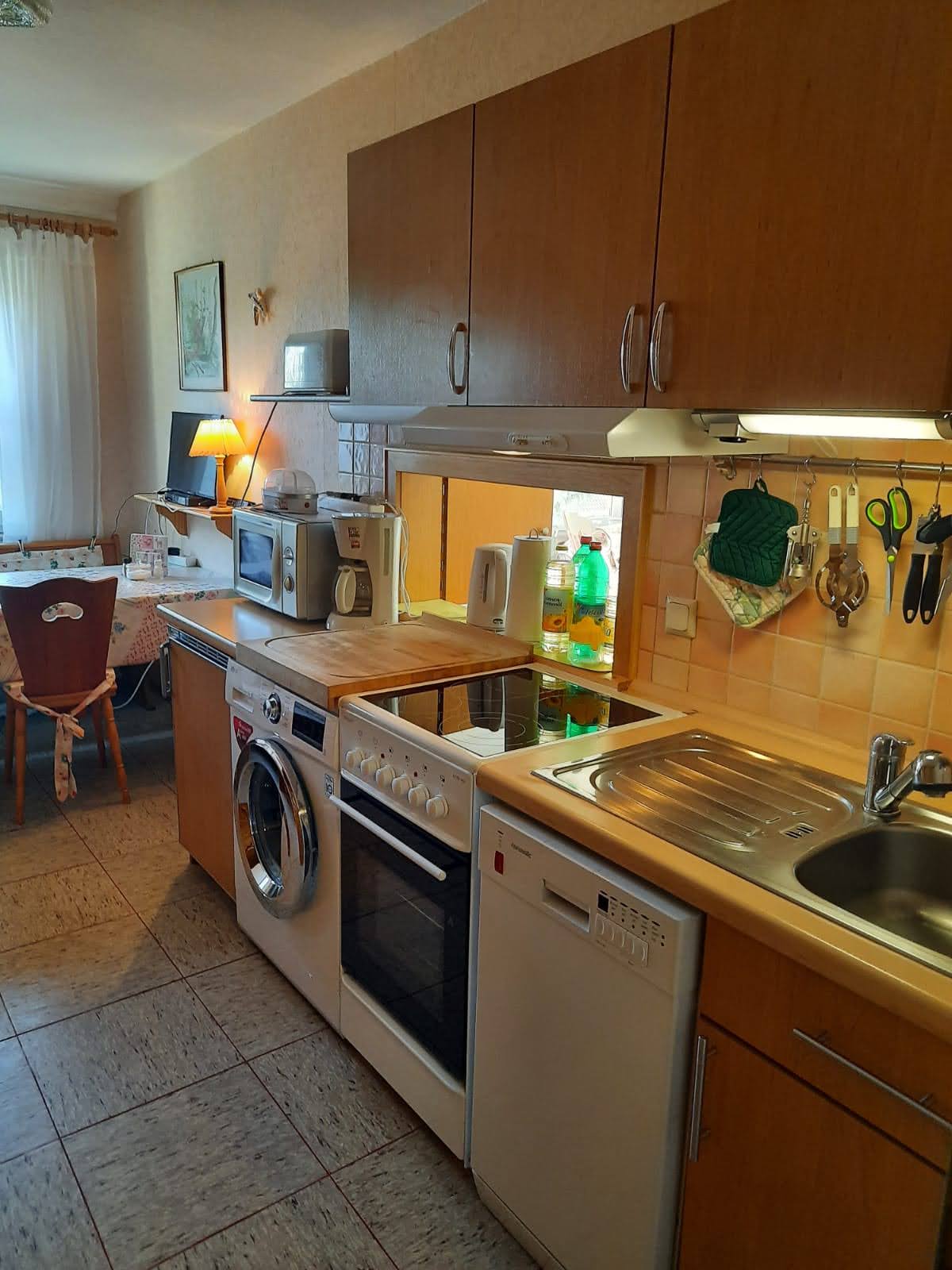 Die Küche beinhaltet außerdem einen Ceranfeld, einen Backofen-/Grill, sowie eine Microwelle, Eierkocher, Kaffemaschine, Toaster, Wasserkocher, Spülmaschine und Waschmaschine.
