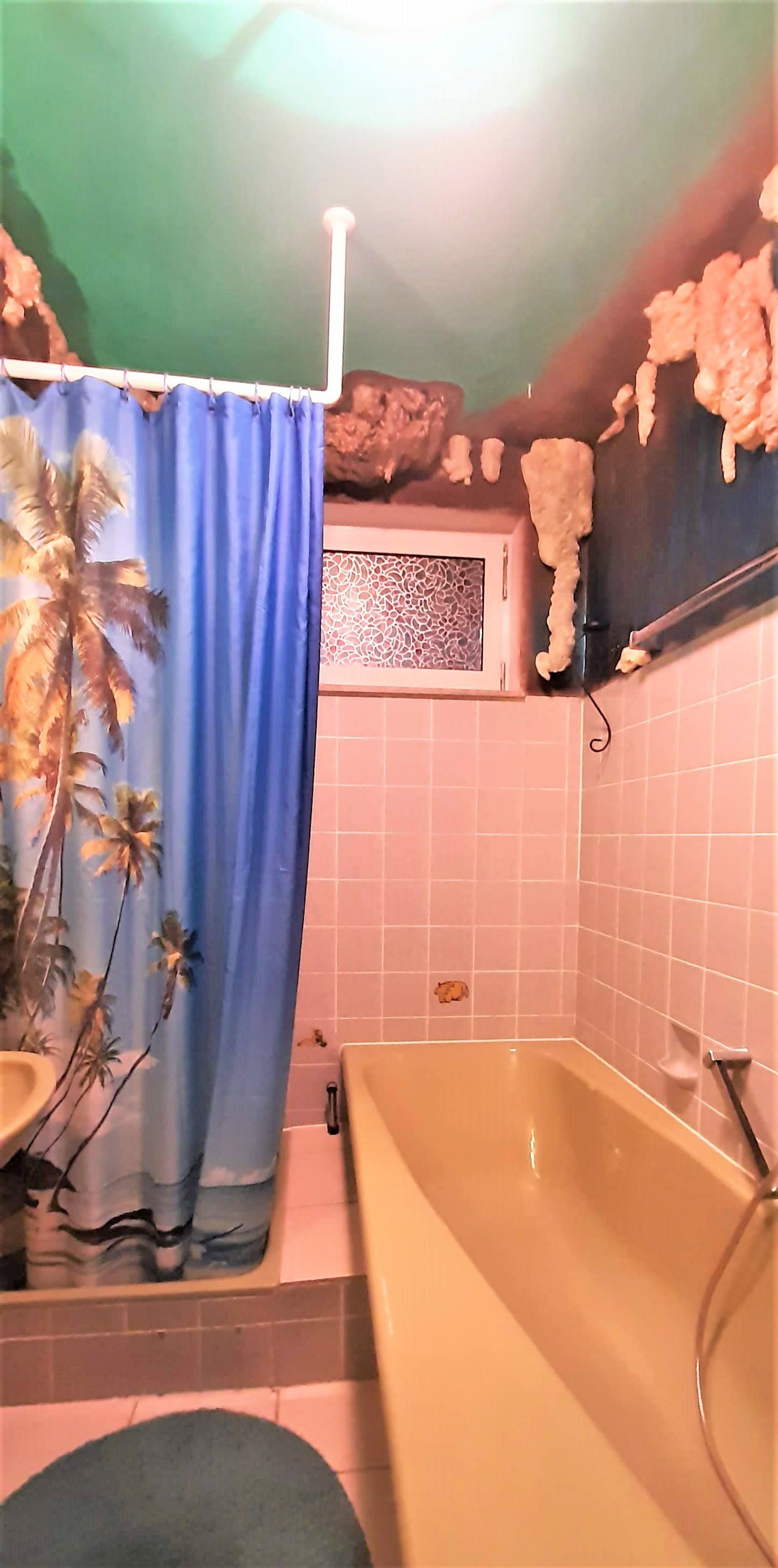 Unsere kreative Badezimmergestaltung entführt unsere Gäste in die Welt des Films "Der Fluch der Karibik" mit der Gummimaske von Davi Jones. Das Bad besitzt Dusche, Badewanne und Toilette.