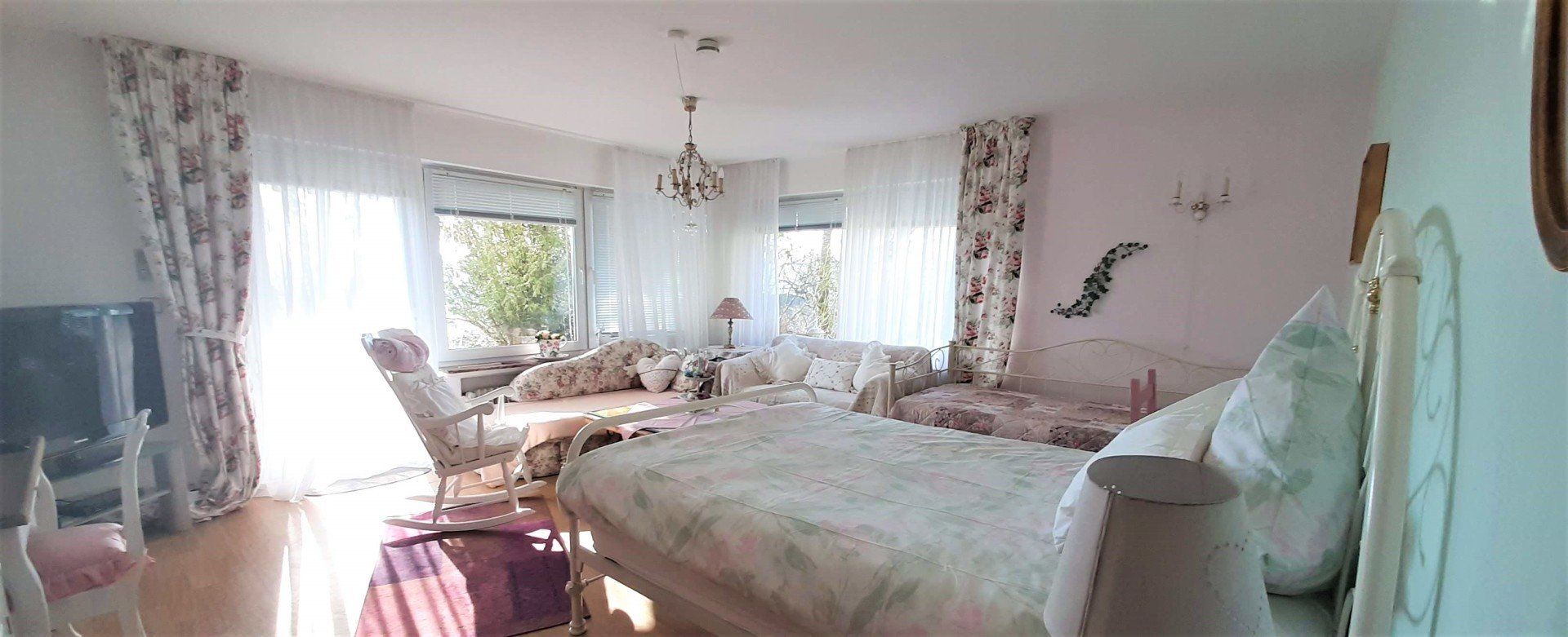 In dem hellen, lichtdurchfluteten Schlaf-/Wohnbereich befindet sich ein französisches Bett für 1-2 Personen und ein weiteres Bett für eine weitere Person, 2 Canapés, gemütlicher Sessel und weitere Sitzgelegenheiten um zu entspannen ergänzt durch einen Fernseher (Flachbild-TV ) und Radio.